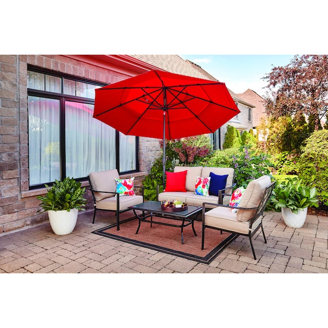 The Glenn Hill loveseat and coffee table set has a traditional style and a timeless look. The frames are made from durable steel, and the tan cushions are covered in super-resistant olefins fabric to ensure they keep their pristine look for years to come. This set includes 1 loveseat and 1 coffee table with an easy to clean glass top.